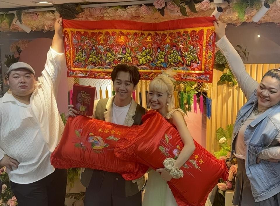 两人期间还抱着大红色的鸳鸯枕头拍照,身后还有喜气洋洋的传统喜幛,气氛感拉满,老板送 lulu 金铲子,喊话两人要早生贵子。